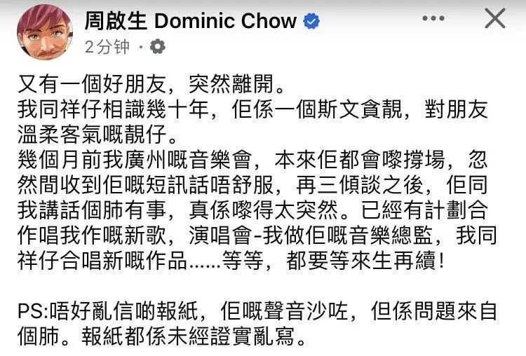 “真的来得太突然,已经有计划合作唱我写的新歌,演唱会我做他的音乐总监,我和祥仔合唱新的作品等等,都要等来生再续!”